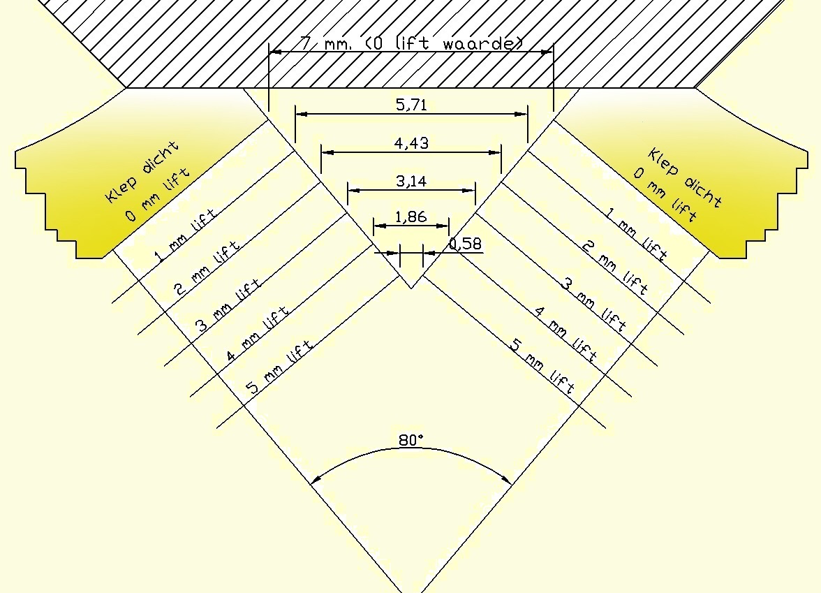 Wanneer beide nokkenassen hun kleppen tijdens overlap 4 mm open drukken dan is de afstand tussen beide kleppen met meer dan 5 mm afgenomen (bij een klephoek van 80 graden).