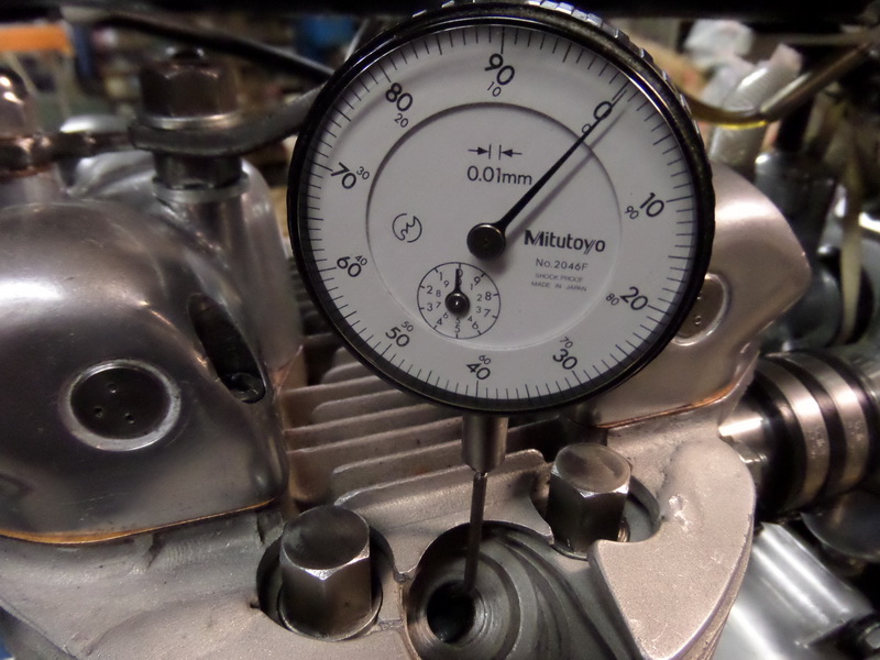 De krukas vooruit draaien totdat de zuiger 10 mm is gezakt en het aantal graden aflezen. De krukas achteruit draaien zodat de zuiger weer omhoog gaat, doordraaien totdat de zuiger weer 10 mm is gezakt. Het aantal graden moet bij 10mm vooruit en 10mm achteruit draaien gelijk zijn, zoniet de "aanwijzer" corrigeren.