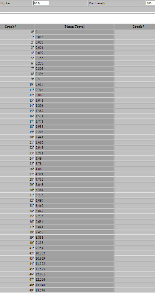 Dit is goed te zien in het overzichtje helemaal onderaan deze pagina. Dit overzicht laat de zuigerverplaatsing zien voor een motor met een slag van 65,5 millimeter en een drijfstanglengte van 135 millimeter (Triumph unit 350 en 500).