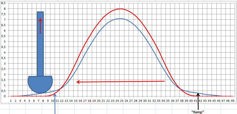 De blauwe pijl geeft de plek aan waar een nokkenas zonder "Ramp" (rode lijn) schade zal oplopen wanneer een verkeerde, te grote klepspeling wordt toegepast. Deze blauwe pijl geeft de benodigde klepspeling aan van het blauwe profiel en niet van het rode profiel.